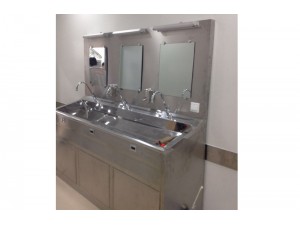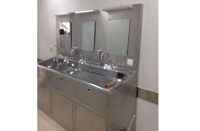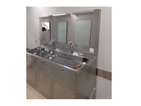 洗手池是手术医务人员洗手专用设备,采用人体感应自动给水,因此无需使用人员触摸,保证清洁,流量500l/h,采用0.1μm超滤膜,可将至毒病菌全部滤掉,同时采用双柱超滤组件,具备反冲技术,可长期使用。 特点: 1.整体采用不锈钢SUS304、1.2mm不锈钢双层制造,中间特殊静音处理。槽身以人体工程学设计,外观美观,且洗手时水花不会溅在身上。 2.鹅颈型水龙头,全自动感应或脚踏、腿部触碰几种给水方式,避免医护人员的手部碰触,有效防止洗手时的交叉感染。 3.配备40-50L热水器和恒温供水装置,水温可根据客户的使用习惯20°—75°自由设定。 4.水池内部采用圆弧角度、无缝焊接、深度打磨、抛光处理。无死角、易于清洁消毒处理,有效防止细菌滋生。 5.配套设备完善,配有自动给药机,照明灯及防雾整装镜辅助设备。 6.多种型号、多个系列产品可供客户选择,也可根据客户的使用要求生产加工。
