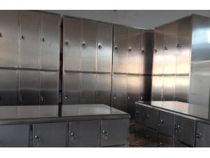 不锈钢消毒鞋柜 用不锈钢发热盘产生一定的温度,对鞋子底部进行加热,使鞋子底部温度升高,从而使鞋子内部的汗气缓慢挥发。 消毒鞋柜内还装有臭氧发生器(或紫外线杀菌灯)和低温电热元件以及微电脑控制系统,通过电脑控制,使鞋柜内产生合适浓度的臭氧,利用臭氧的化学特性,对鞋进行除臭和杀菌防霉护理;同时控制电热元件间断地工作,使鞋柜内维持一个合适的温暖的温度,缓慢地对鞋子进行烘干护理 规格:304不锈钢/紫外/抽风/20人,每格尺寸宽250*高300/独立门(平时关闭)强磁门吸/厚度1.0mm(实际厚度0.92mm) 下方开孔便于空气流通,施工含风管搭建,排风机功率180w=1台,电源220v,50hz,杀菌灯1*20w=8支