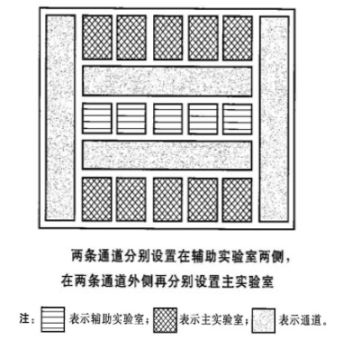 在主要实验室与辅助实验室之间设置了两条通道,辅助实验室设置在两条通道之间,主要实验室设置在两条通道的外侧,辅助实验室的深度比主要实验室的深度浅。其特点有利于空调面积较多的实验室,可以节约能源,室内温度波动小。同时由于建筑物加大了进深,可以节约用地,建筑物内管网也易于集中,各实验室间交通相对缩短。它的特殊形式是环形通道,适宜于洁净要求高的高纯度实验室,同时也有利于事故发生时人员疏散。